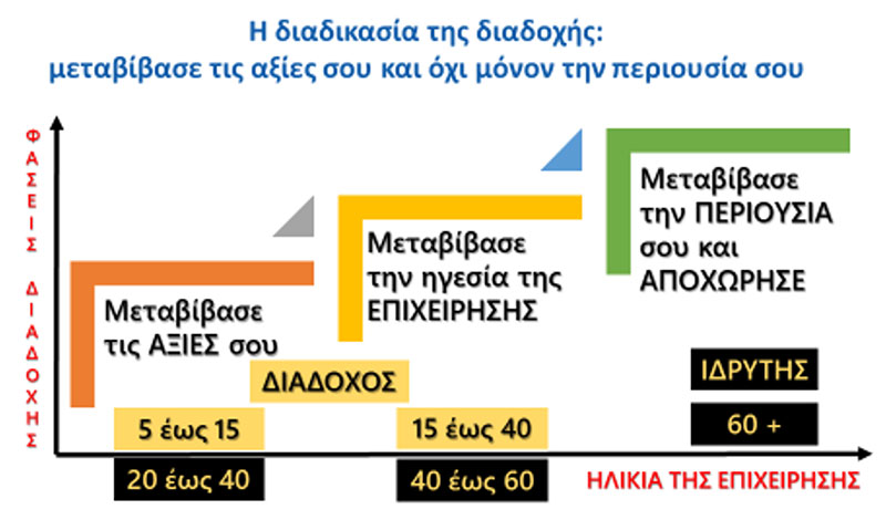 Όπως φαίνεται ξεκάθαρα στο γράφημα, το έργο του ιδρυτή ξεκινάει µε τη διαπαιδαγώγηση των παιδιών του σχετικά µε τις βασικές αξίες που ο ίδιος ακολούθησε κατά τη διάρκεια του μακροχρόνιου και δύσκολου ταξιδιού της δημιουργίας της οικογενειακής επιχείρησης. Συνεχίζεται µε τη μεταβίβαση της ηγεσίας της επιχείρησης και ολοκληρώνεται µε τη μεταβίβαση της περιουσίας και την αποχώρησή του.
